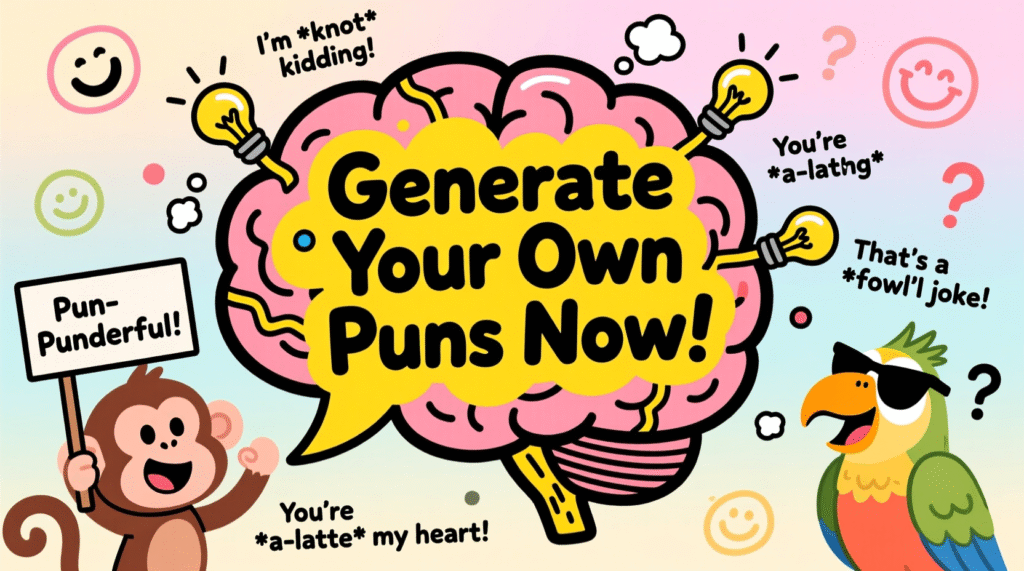 Want puns that match your fruit, mood, or message? Craft unlimited new zingers using our powerful pun generator. Whether it’s for Instagram captions, greeting cards, or witty group chats, it creates fresh wordplay at the click of a button. Try it and watch the puns practically write themselves!